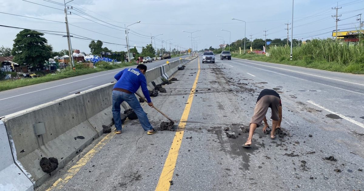 ตำรวจ สภ.พระขาว ร่วมกับประชาชนจิตอาสา ดำเนินการกวาดก้อนดินตกหล่น บนถนน อยุธยา-เสนา