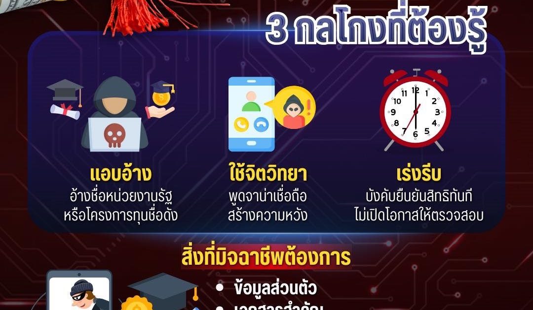 ระวัง‼️ กลลวงหลอกวัยรุ่น นักเรียน นักศึกษา เสี่ยงตกเป็นเหยื่อ 10/03/2026 โดย admin / ข่าวประชาสัมพันธ์,ข่าวฝากประชาสัมพันธ์ ระวัง กลลวงหลอกวัยรุ่น นักเรียน นักศึกษา เสี่ยงตกเป็นเหยื่อ ติดต่อมา อ้างแจ้งสิทธิทุนเรียนต่อ พูดจาหว่านล้อม สร้างความน่าเชื่อถือ ให้ความหวังได้ทุนการศึกษา ออกอุบายให้เร่งโอนเงิน ที่ต้องจ่ายล่วงหน้า อ้างว่าเป็นค่าธรรมเนียม ค่ารักษาสิทธิ ไม่เปิดโอกาสให้ตรวจสอบ เช็กก่อนเชื่อ ไม่รีบ ไม่โอน  สอบถามโทร 1441 ศูนย์ AOC ด้วยความปรารถนาดีจากสำนักงานตำรวจแห่งชาติ  #ทุนการศึกษา #ทุนเรียนต่อ #เตือนภัยออนไลน์ #สำนักงานตำรวจแห่งชาติ #Royalthaipolice