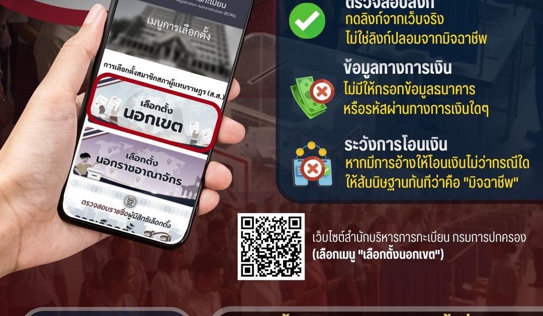 ลงทะเบียนเลือกตั้งล่วงหน้าอย่างปลอดภัย อย่าหลงกลมิจฉาชีพ “ฉกข้อมูล – หลอกโอนเงิน” 24/12/2025 โดย admin / ข่าวประชาสัมพันธ์,ข่าวฝากประชาสัมพันธ์ ลงทะเบียนเลือกตั้งล่วงหน้าอย่างปลอดภัยอย่าหลงกลมิจฉาชีพ “ฉกข้อมูล – หลอกโอนเงิน”ตรวจสอบแหล่งที่มาของลิงก์ลงทะเบียนให้แน่ใจ ว่าไม่ใช่ลิงก์ของมิจฉาชีพระบบลงทะเบียนเลือกตั้งล่วงหน้า ไม่มีการให้กรอกข้อมูลเกี่ยวกับธนาคาร หรือการเงินหากลิงก์ใดใดนำไปสู่การโอนเงิน ให้จำไว้เลยว่า มันคือ “มิจฉาชีพ” หากไม่มั่นใจว่าลิงก์ที่ได้มาปลอดภัยหรือไม่ สามารถลงทะเบียนออนไลน์ได้ที่ เว็บไซต์ของ สำนักบริหารการทะเบียน กรมการปกครอง แล้วกดเลือกเมนู “เลือกตั้งนอกเขต” https://boraservices.bora.dopa.go.th/election/.ลงทะเบียนเลือกตั้งล่วงหน้าได้ตั้งแต่ 20 ธ.ค. 2568 – 5 ม.ค. 2569 ผ่านระบบออนไลน์ได้ 24 ชั่วโมง. วันเลือกตั้งล่วงหน้า1 ก.พ. 2569 วันเลือกตั้งทั่วประเทศ8 ก.พ. 2569.#เลือกตั้ง2569 #เลือกตั้งล่วงหน้า#สำนักงานตำรวจแห่งชาติ#Royalthaipolice