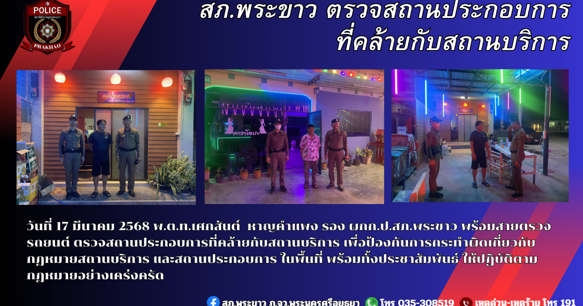 สภ.พระขาว ตรวจสถานประกอบการฯ 17/03/2025 โดย admin / งาน ปป. เดือน มี.ค.68,งานจราจร เดือน มี.ค.68,ผลการปฏิบัติงานจราจร,ผลการปฏิบัติงานป้องกันปราบปราม สภ.พระขาว ตรวจสถานประกอบการฯวันที่ 17 มีนาคม 2568ภายใต้การอำนวยการของ พ.ต.อ.กฤษฎาพร จงอักษร ผกก.สภ.พระขาวนำโดย พ.ต.ท.เศกสันต์ หาญคำแพง รอง ผกก.ป.สภ.พระขาว พร้อมสายตรวจรถยนต์ และสายตรวจจราจร ตรวจสถานประกอบการที่คล้ายกับสถานบริการ เพื่อป้องกันการกระทำผิดเกี่ยวกับกฎหมายสถานบริการและสถานประกอบการ ในพื้นที่พร้อมทั้งประชาสัมพันธ์ ให้ปฏิบัติตามกฎหมายอย่างเคร่งครัด