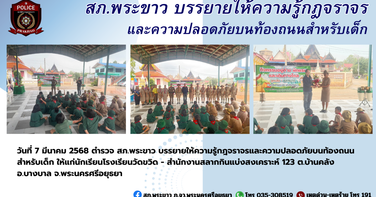 สภ.พระขาว บรรยายให้ความรู้กฎจราจรและความปลอดภัยบนท้องถนนสำหรับเด็ก 07/03/2025 โดย admin / งานจราจร เดือน มี.ค.68,ผลการปฏิบัติงานจราจร สภ.พระขาว บรรยายให้ความรู้กฎจราจรและความปลอดภัยบนท้องถนนสำหรับเด็ก วันที่ 7 มีนาคม 2568 ภายใต้การอำนวยการของ พ.ต.อ.กฤษฏาพร จงอักษร ผกก.สภ.พระขาว, พ.ต.ท.เศกสันต์ หาญคำแพง ผกก.ป.ฯ/พ.ต.ท.สราวุธ โกษีโรจน์ สวป.ฯ พ.ต.ท.ธีรพงศ์ อุทยาน สว.กก.สส.ภ.จว.อ่างทอง วิทยากรรับเชิญ พร้อมชุด ชมส.สภ.พระขาว บรรยายให้ความรู้กฎจราจรและความปลอดภัยบนท้องถนนสำหรับเด็ก ให้แก่นักเรียนโรงเรียนวัดขวิด – สำนักงานสลากกินแบ่งสงเคราะห์ 123 ต.บ้านคลัง อ.บางบาล จ.พระนครศรีอยุธยา