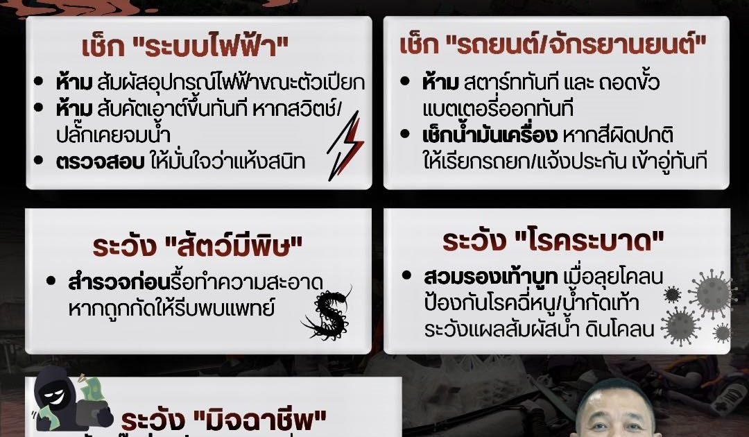 – ก่อนเข้าไปทำความสะอาดบ้าน ให้สำรวจซอกมุม ตู้ ลิ้นชัก หรือกองวัสดุต่าง ๆ อย่างระมัดระวัง เพราะอาจมี งู ตะขาบ หรือแมงป่อง หนีน้ำเข้ามาหลบซ่อนตัว