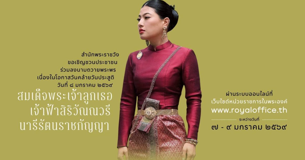 สำนักพระราชวัง ขอเชิญชวนประชาชนร่วมลงนามถวายพระพร สมเด็จพระเจ้าลูกเธอ เจ้าฟ้าสิริวัณณวรี นารีรัตนราชกัญญา เนื่องในโอกาสวันคล้ายวันประสูติ 07/01/2026 โดย admin / ข่าวประชาสัมพันธ์,ข่าวฝากประชาสัมพันธ์ สำนักพระราชวัง ขอเชิญชวนประชาชนร่วมลงนามถวายพระพร สมเด็จพระเจ้าลูกเธอ เจ้าฟ้าสิริวัณณวรี นารีรัตนราชกัญญา เนื่องในโอกาสวันคล้ายวันประสูติ วันที่ ๘ มกราคม ๒๕๖๙ ผ่านระบบออนไลน์ ที่เว็บไซต์หน่วยราชการในพระองค์ www.royaloffice.th ระหว่างวันที่ ๗ – ๙ มกราคม ๒๕๖๙#ทรงพระเจริญ