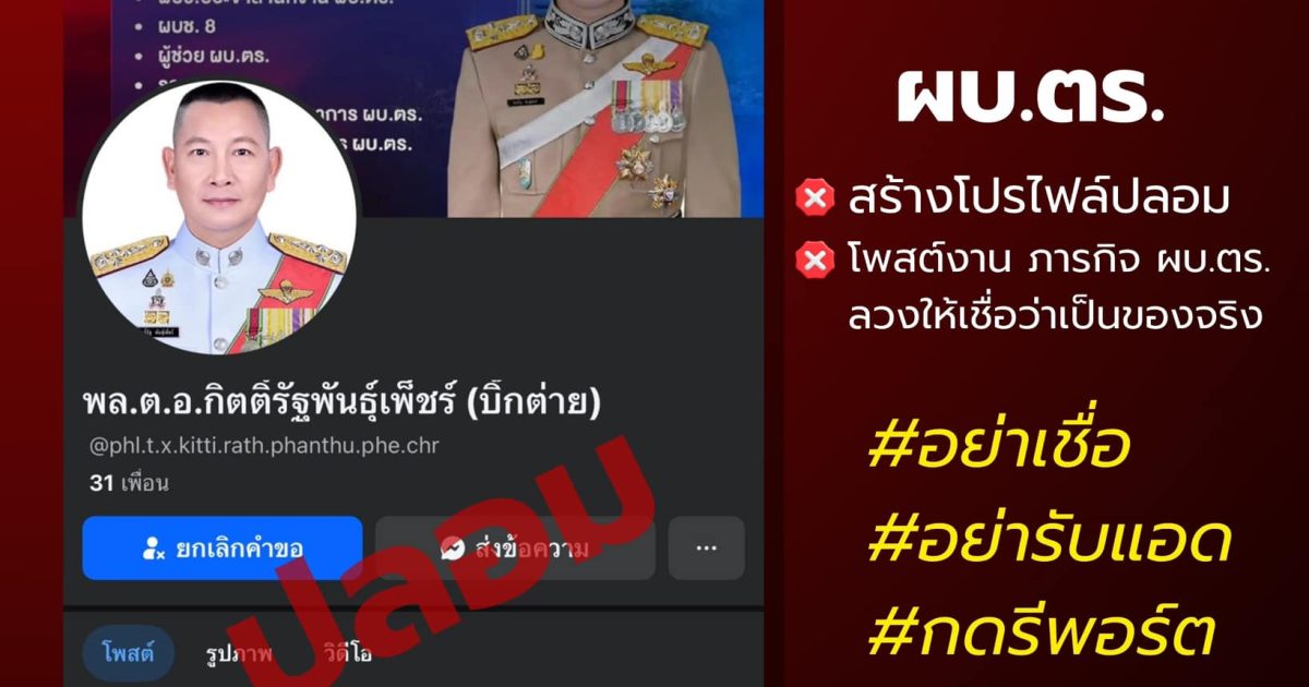 อย่าเชื่อ อย่ารับแอด กดรีพอร์ต “บัญชีเฟซบุ๊กปลอม” แอบอ้าง เป็น ผบ.ตร. 23/03/2025 โดย admin / ข่าวประชาสัมพันธ์,ข่าวฝากประชาสัมพันธ์ อย่าเชื่อ อย่ารับแอด กดรีพอร์ต “บัญชีเฟซบุ๊กปลอม” แอบอ้าง เป็น ผบ.ตร. สร้างโปรไฟล์ปลอม โพสต์ งาน ภาพภารกิจ ทำให้ดูเหมือนของจริง#เตือนภัยออนไลน์ : มิจฯ มักใช้วิธีสร้างโปรไฟล์ปลอมเป็นคนมีชื่อเสียงเพื่อหลอกลวง ขอแอดเป็นเพื่อน พูดคุยตีสนิทชักชวนลงทุนหลอกล่อเอาทรัพย์สินพบเบาะแส สอบถาม โทร.1599 สายด่วนสำนักงานตำรวจแห่งชาติ