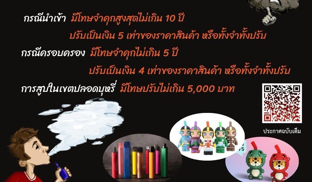 อันตรายต่อสุขภาพ บุหรี่ไฟฟ้า 08/01/2026 โดย admin / ข่าวประชาสัมพันธ์,ข่าวฝากประชาสัมพันธ์ อันตรายต่อสุขภาพ• สารเคมีและนิโคตินทำลายปอด หัวใจ และสมอง• เสี่ยงภาวะปอดอักเสบเฉียบพลัน หายใจล้มเหลว• ทำให้เกิดการเสพติด กระทบพัฒนาการของเยาวชน• เพิ่มความเสี่ยงโรคเรื้อรังในระยะยาว ผิดกฎหมายหลายบท• ห้ามนำเข้า จำหน่าย หรือครอบครองเพื่อการค้า• ผู้ฝ่าฝืนมีโทษทั้ง จำคุกและปรับ ตามกฎหมายที่เกี่ยวข้องหลายฉบับ• การโฆษณาหรือชักชวนก็มีความผิด