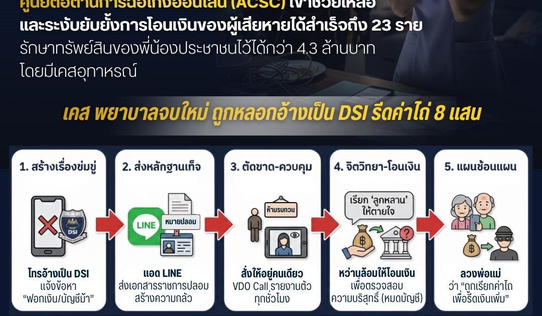 ในรอบสัปดาห์ที่ผ่านมา มีเคสรับแจ้งผ่านทางศูนย์ ACSC และสามารถประสานงานร่วมกันกับทุกภาคส่วน ประกอบกับประสานให้เจ้าหน้าที่ตำรวจในพื้นที่เข้าตรวจสอบพร้อมช่วยเหลือเหยื่ออย่างทันท่วงที โดยเป็นการเข้าตรวจสอบทั้งหมด 14 เคส และเราสามารถช่วยเหลือรวมทั้งระงับการโอนเงินของผู้เสียหายก่อนจะโอนเงินไปยังบัญชีของมิจฉาชีพได้ทั้งหมดจำนวน 23 ราย คิดเป็นจำนวนเงินกว่า 4,362,200 บาท