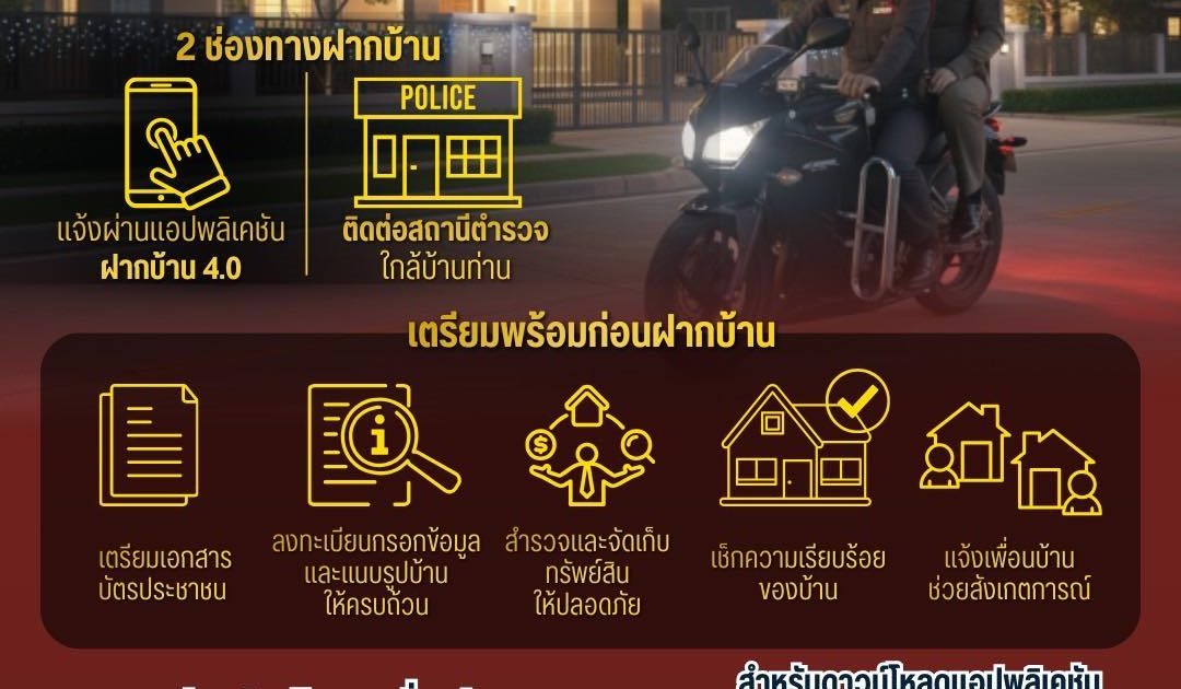 เริ่มแล้ว “ฝากบ้านไว้กับตำรวจ“ ปีใหม่ 2569 เดินทางท่องเที่ยวปลอดภัย อุ่นใจหายห่วง “ฝากบ้าน” ให้ตำรวจดูแล 22/12/2025 โดย admin / ข่าวประชาสัมพันธ์,ข่าวประชาสัมพันธ์,ข่าวฝากประชาสัมพันธ์ เริ่มแล้ว “ฝากบ้านไว้กับตำรวจ“ปีใหม่ 2569 เดินทางท่องเที่ยวปลอดภัย อุ่นใจหายห่วง “ฝากบ้าน” ให้ตำรวจดูแล เริ่ม 22 ธันวาคม 2568 – 5 มกราคม 25692 ช่องทางฝากบ้าน1. แจ้งผ่านแอปพลิเคชัน “ฝากบ้าน” ดาวน์โหลดผ่าน App store และ Google play เท่านั้น2. ติดต่อโดยตรงที่สถานีตำรวจในพื้นที่บ้าน กรอกแบบฟอร์มฝากบ้านกับตำรวจสอบถาม แจ้งเหตุ โทร.191 หรือ 1599#ฝากบ้านกับตำรวจ#ปีใหม่2569#สำนักงานตำรวจแห่งชาติ#Royalthaipolice