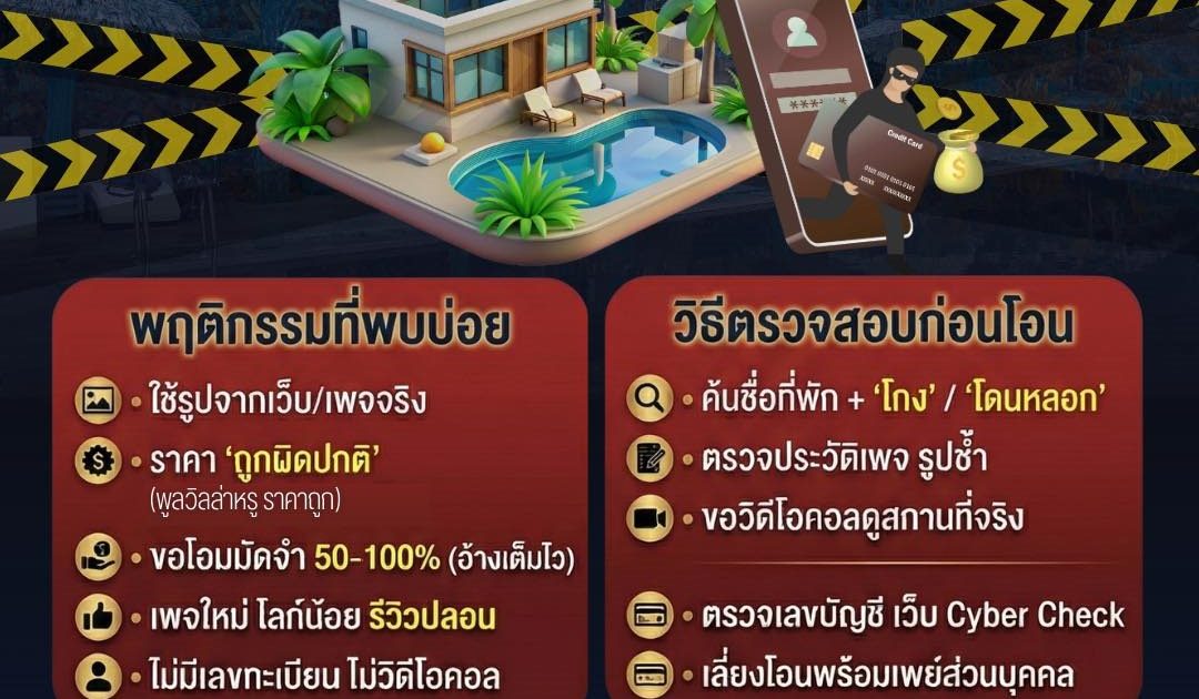 เอ๊ะ สักนิด ก่อนจองที่พัก วางแผนวันหยุดจะไปเที่ยว ระวัง เพจที่พักปลอมหลอกโอนเงิน 06/12/2025 โดย admin / ข่าวประชาสัมพันธ์,ข่าวประชาสัมพันธ์,ข่าวฝากประชาสัมพันธ์ เอ๊ะ สักนิด ก่อนจองที่พัก วางแผนวันหยุดจะไปเที่ยว ระวัง เพจที่พักปลอมหลอกโอนเงิน เพจปลอมมักทำให้ดูเหมือนของจริง ใช้ภาพและข้อมูลจากของจริง ให้ราคาถูกกว่าปกติ ที่พักหรูราคาต่ำ เสนอโปรโมชันชวนให้รีบตกลงใจ มักให้รีบโอนมัดจำ หรือค่าห้องทั้งหมด อ้างว่าเต็มไว เอ๊ะ! สักนิด เช็กก่อน ไม่เชื่อไม่รีบไม่โอน #เตือนภัยออนไลน์ #สำนักงานตำรวจแห่งชาติ #Royalthaipolice