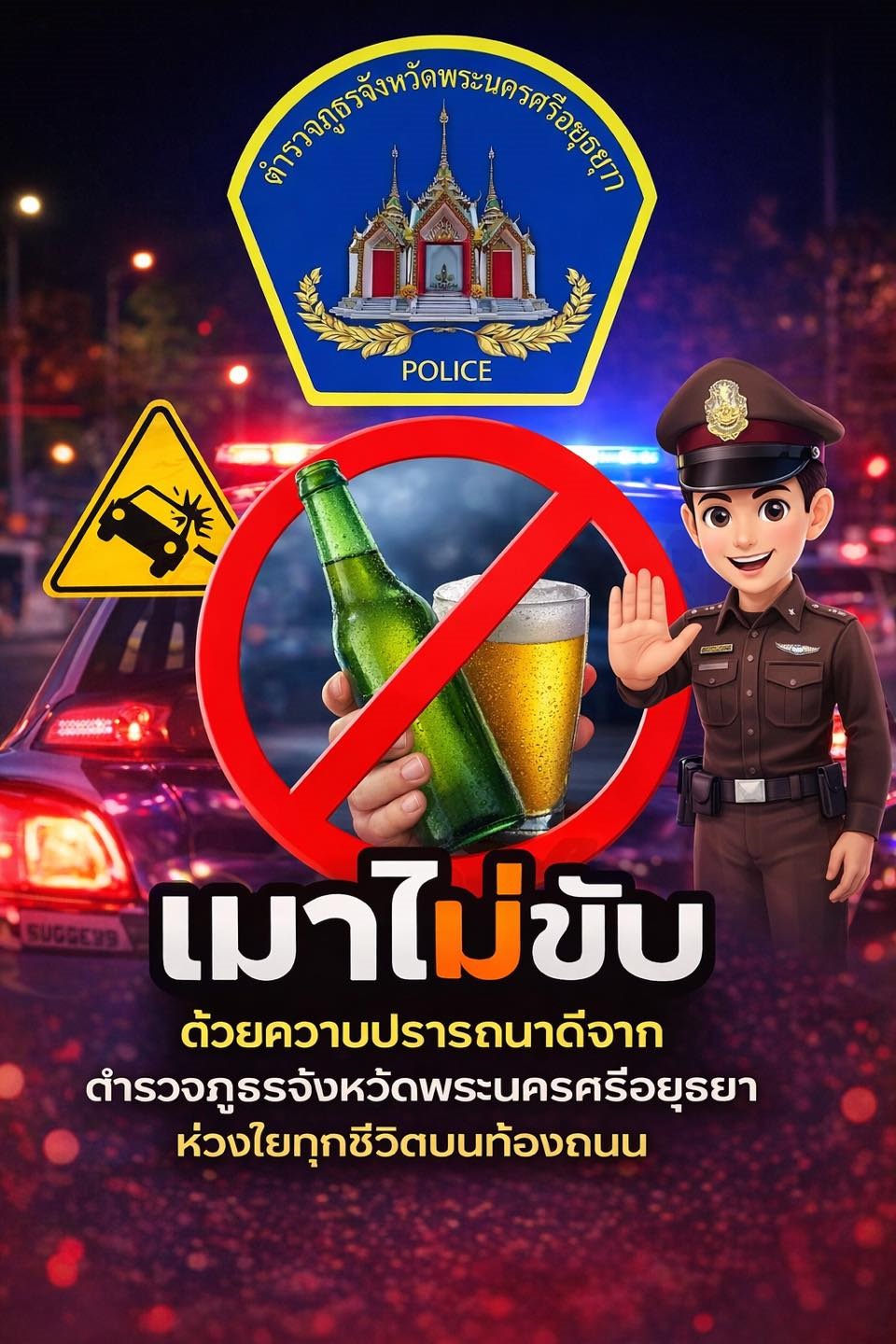เมาไม่ขับ ลดความเสี่ยง หยุดอุบัติเหตุ สร้างความปลอดภัยให้สังคม ด้วยความปรารถนาดีจาก ตำรวจภูธรจังหวัด
