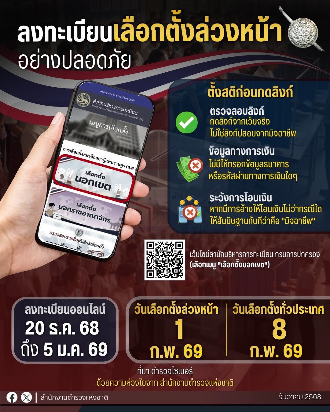 ลงทะเบียนเลือกตั้งล่วงหน้าอย่างปลอดภัย อย่าหลงกลมิจฉาชีพ “ฉกข้อมูล – หลอกโอนเงิน” ตรวจสอบแหล่