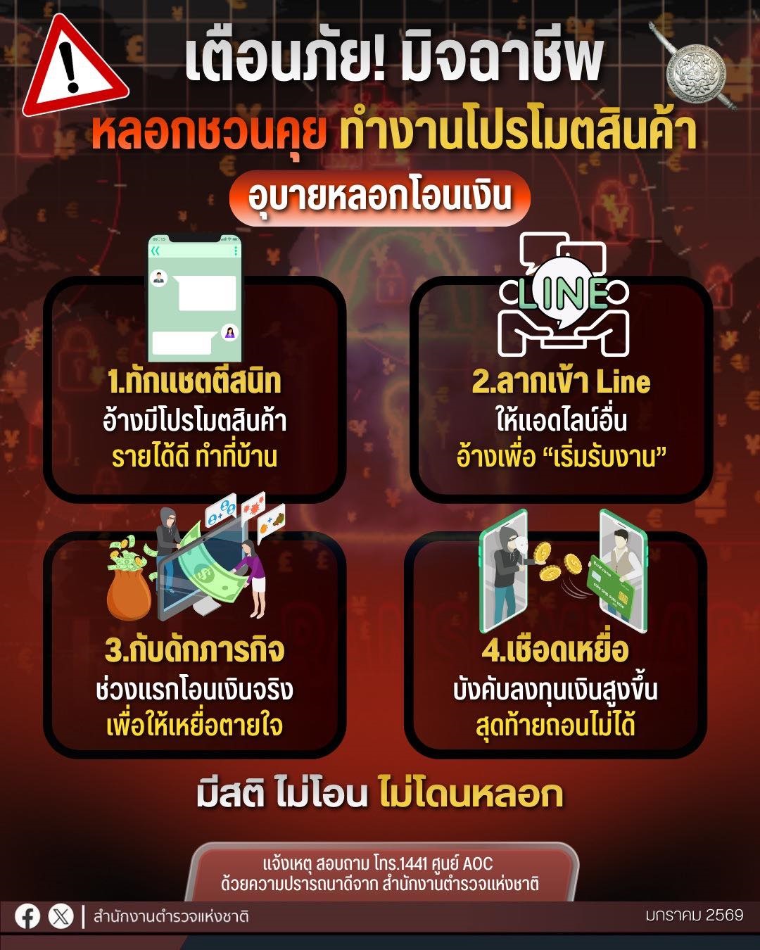 มุกนี้กำลังระบาด มิจจี้ “ชักชวนรายได้พิเศษ” พูดคุยตีสนิทล่อลวงทำอาชีพเสริม ช่วยโปรโมตสินค้า อ้างว่าร