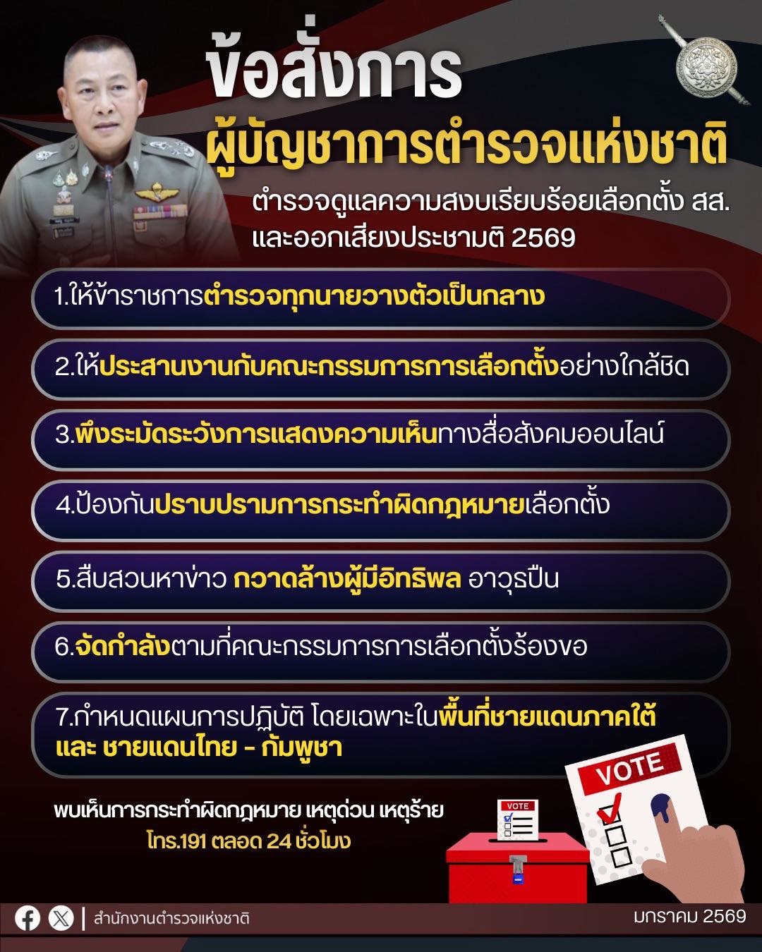 📍ข้อสั่งการ พล.ต.อ.กิตติ์รัฐ พันธุ์เพ็ชร์ ผู้บัญชาการตำรวจแห่งชาติ กำชับ “ตำรวจ” ดูแลความปลอดภัย สงบเรียบร้อยการเลือกตั้ง สส. และออกเสียงประชามติ 2569