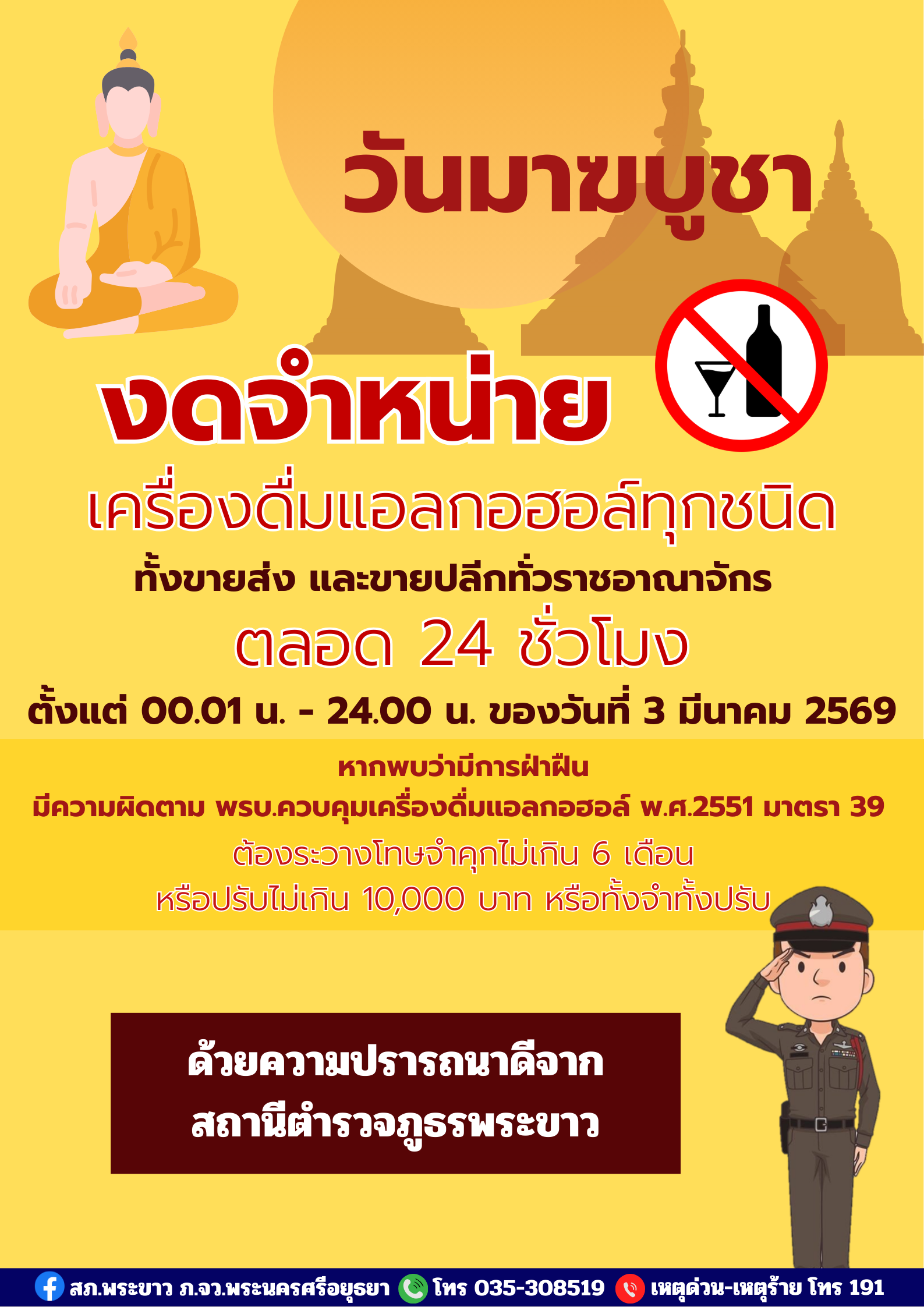 ประกาศงดจำหน่ายเครื่องดื่มแอลกอฮอล์ เนื่องในวันมาฆบูชา วันที่ 3 มีนาคม 2569 ตามพระราชบัญญัติควบคุมเค