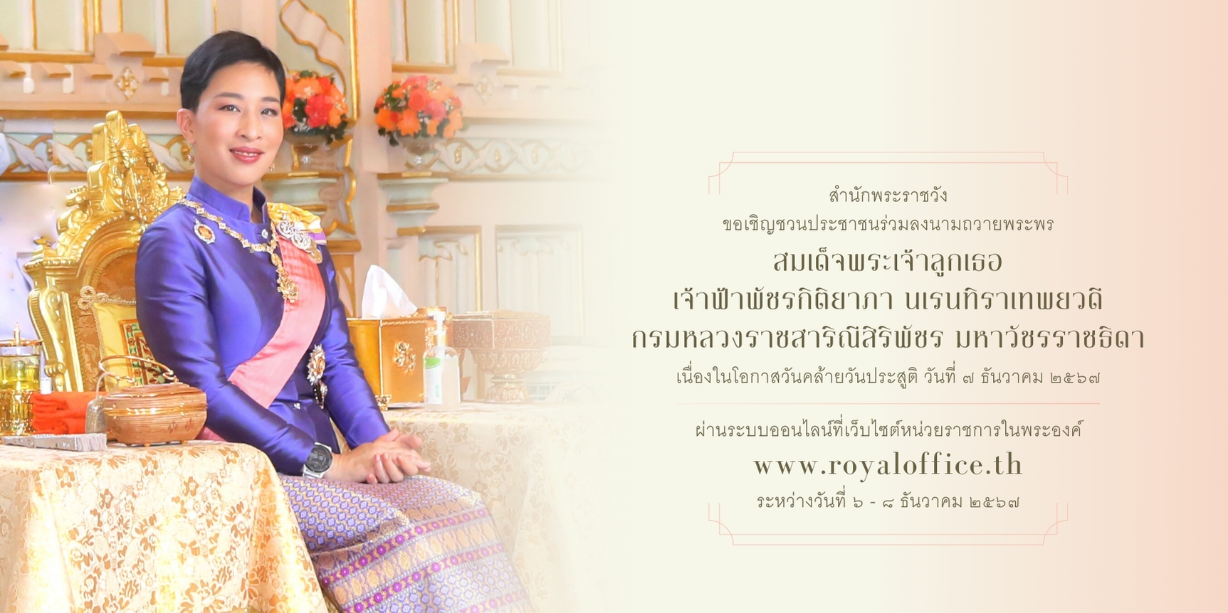 สำนักพระราชวัง ขอเชิญชวนประชาชนร่วมลงนามถวายพระพร สมเด็จพระเจ้าลูกเธอ เจ้าฟ้าพัชรกิติยาภา นเรนทิราเทพยวดี กรมหลวงราชสาริณีสิริพัชร มหาวัชรราชธิดา