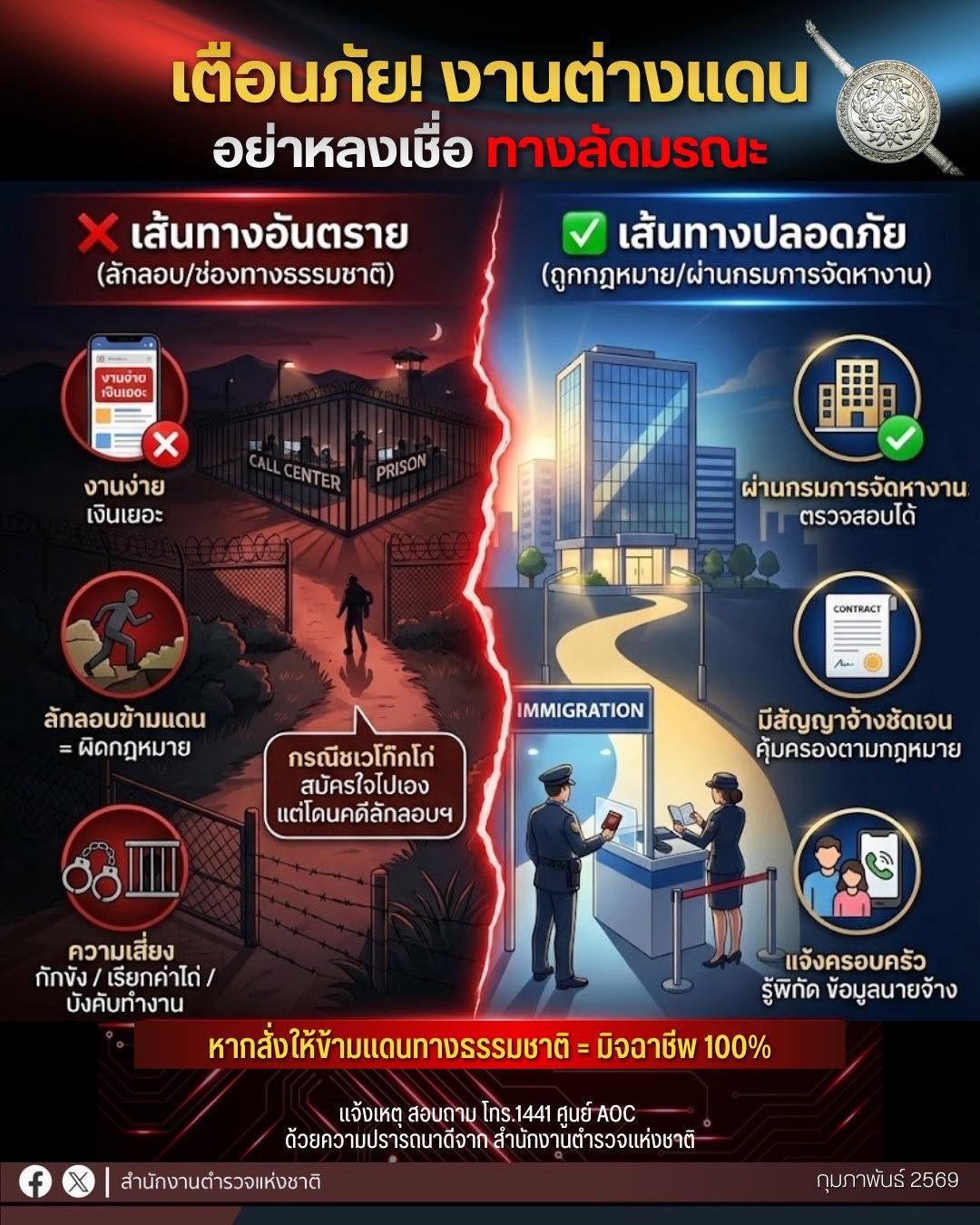 สำนักงานตำรวจแห่งชาติเตือนระวังการหลอกลวงไปทำงานในต่างประเทศ และความเสี่ยงจากการลักลอบข้ามแดน . พล.ต