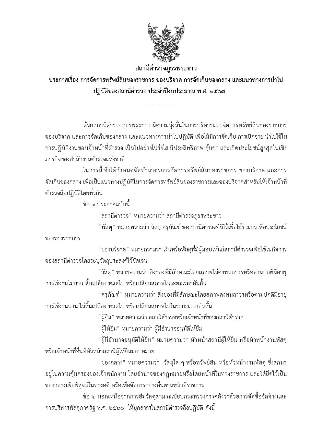 – ประกาศเรื่อง การจัดการทรัพย์สินของราชการ ของบริจาค การจัดเก็บของกลาง และแนวทางการนำไปปฏิบัติของ สภ.พระขาว